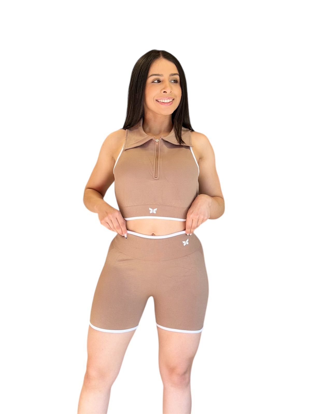 Conjunto deportivo de alto rendimiento compuesto por top con cierre frontal y short biker de ajuste firme. Diseño seamless sin costura frontal, brinda máxima comodidad, libertad de movimiento y un calce que estiliza la silueta. Ideal para entrenar o usar en looks urbanos.