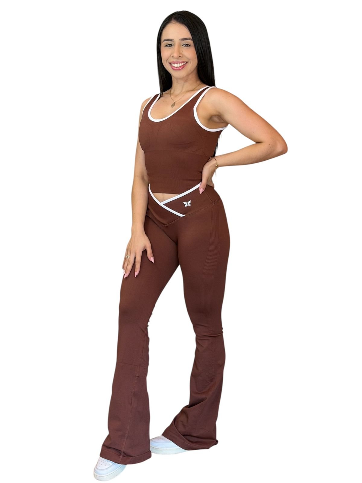 Conjunto de blusa ajustada y legging flare de cintura alta con diseño en V al frente, que estiliza la silueta y realza la figura. Tela suave y elástica para máxima comodidad y movimiento, ideal para entrenar o looks deportivos elegantes.