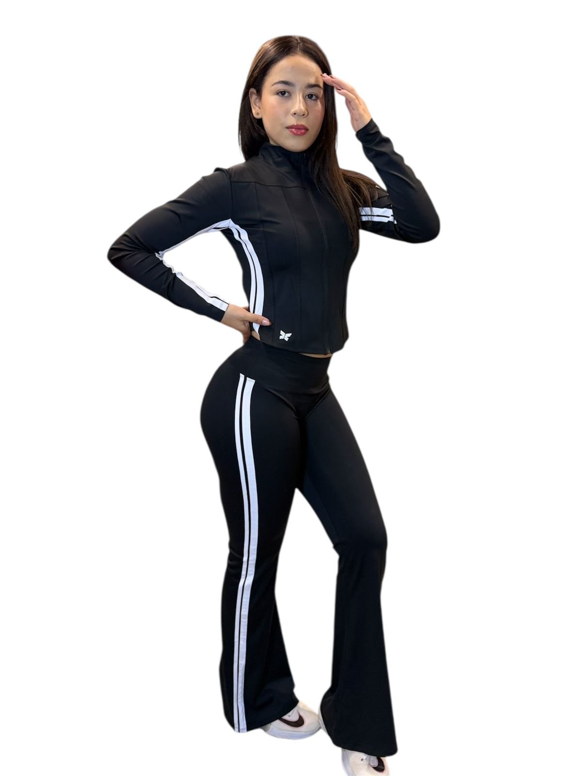 Set compuesto por campera ajustada al cuerpo y leggings corte Flare con efecto push-up que realzan la figura. Una combinación perfecta de estilo y funcionalidad, diseñada para entrenar con comodidad o lucir un look moderno y sofisticado en cualquier ocasión.