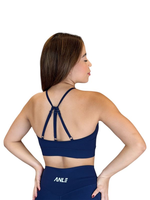 Top de poliamida estilo halter con tiras y hebillas regulables, que permite un ajuste personalizado y cómodo. Su diseño realza la silueta, combina funcionalidad con estilo moderno, ideal para entrenar o para looks urbanos con personalidad.