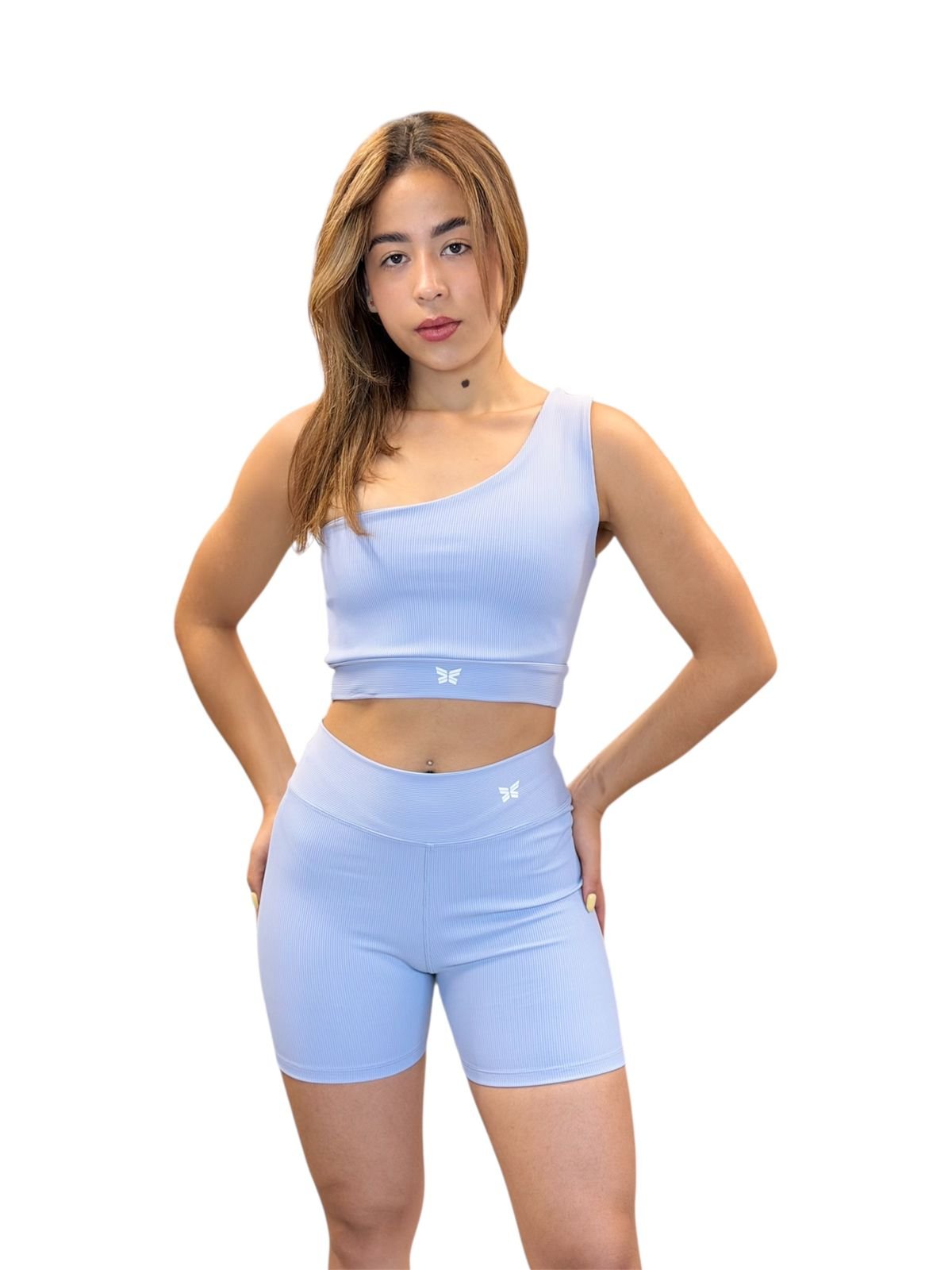 Top de una manga con short de cintura alta que realza y brinda seguridad.