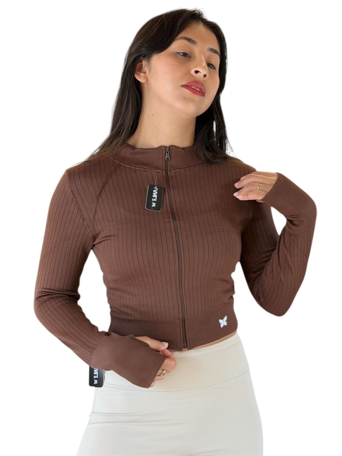 Campera de tejido canalé confeccionada en tela elástica y suave, que se adapta cómodamente al cuerpo aportando textura y estilo. Su diseño incluye cierre frontal y mangas largas con abertura para el pulgar, un detalle funcional que suma confort y un acabado moderno.